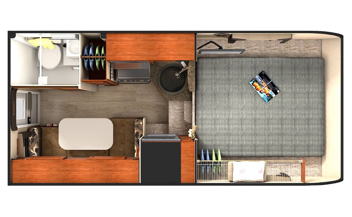 With a spacious wet bath, generous galley countertop, "U"-shaped dinette and full size residential queen-size bed, the 865 brings upscale amenities to this practical package.